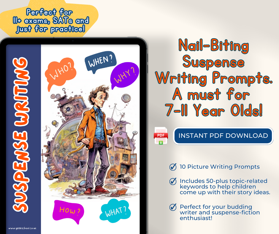 Create edge-of-your-seat stories with our ’11 Plus Suspense Writing Prompts’ booklet!